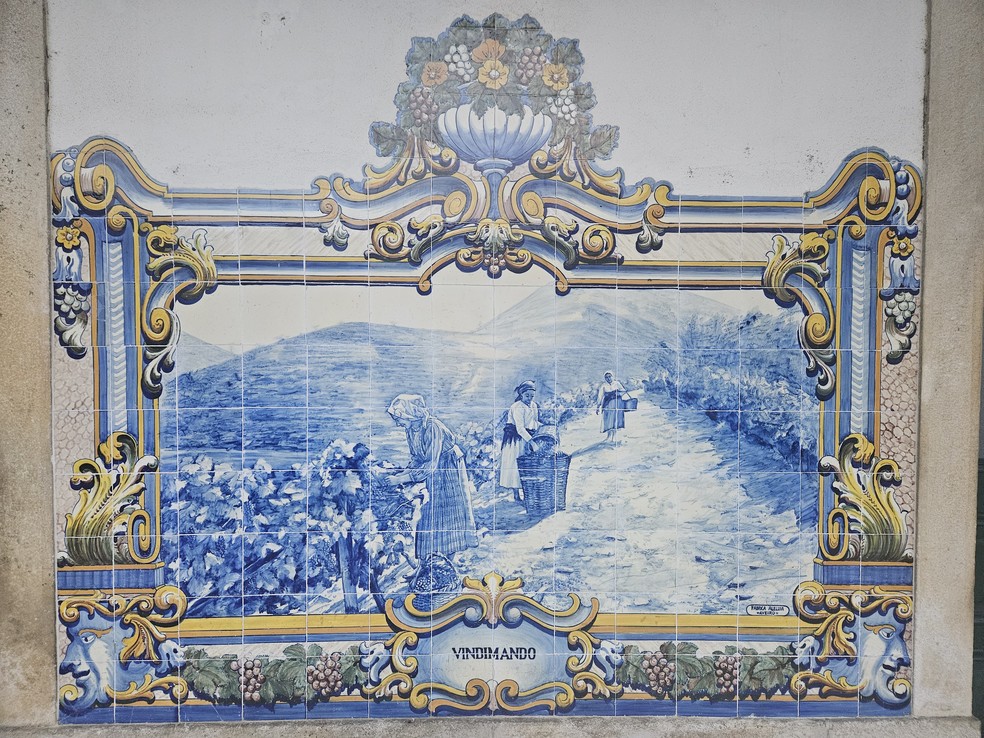 Azulejo na estação ferroviária do povoado do Pinhão,mostra a colheita da uva na maneira tradicional — Foto: Rafael Galdo/O Globo