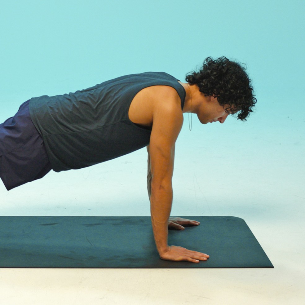 Abaixe-se em uma flexão de braço e pare pelo menos na metade do caminho. Nessa posição,mantenha os cotovelos flexionados a cerca de 45 graus,a caixa torácica para baixo,os glúteos e quadríceps contraídos e o corpo em linha reta. Mantenha a posição sem deixar os quadris subirem ou descerem. Em seguida,empurre o corpo para trás,retornando à posição inicial.