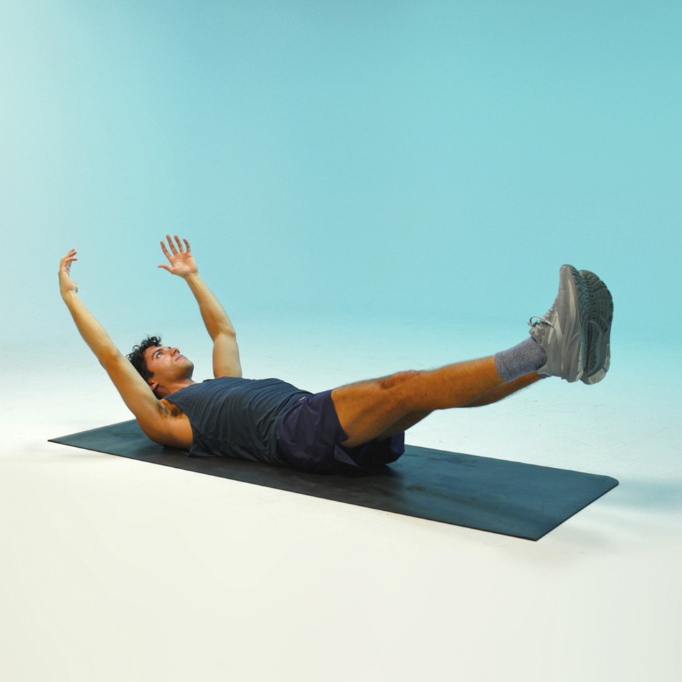 Deite-se de costas com os braços estendidos para cima e as pernas flexionadas em posição de mesa. Estenda o braço direito para trás,próximo à orelha,e estenda a perna esquerda em um ângulo baixo acima do chão. Tente não deixar a lombar arquear para fora do chão. Mantenha a posição por 10 a 20 segundos. Retorne à posição inicial e alterne os lados.