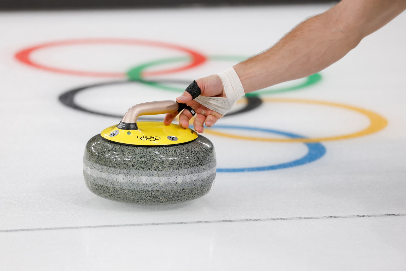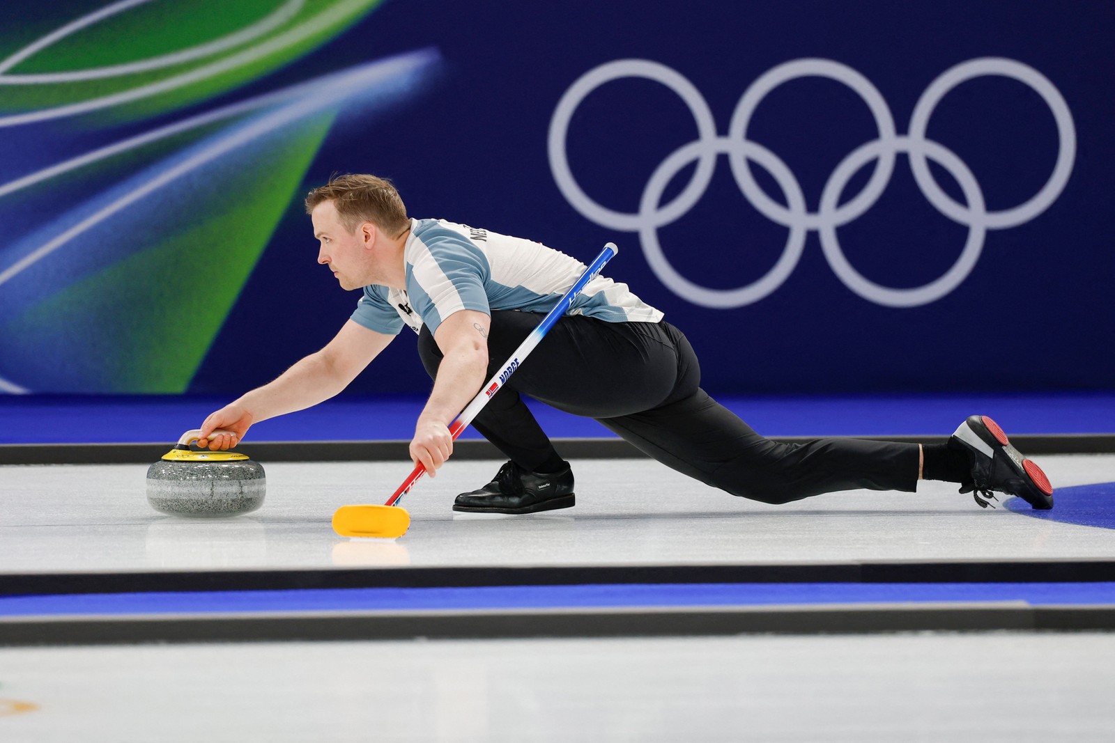 O americano Korey Dropkin lança a pedra na partida de curling de duplas mistas entre a República Tcheca e os Estados Unidos durante os Jogos Olímpicos de Inverno de Milão-Cortina 2026,em 6 de fevereiro de 2026. — Foto: ANDERSEN / AFP