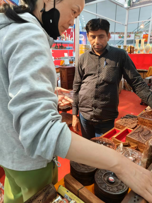 Mahmood observou cuidadosamente essas belas esculturas em madeira, engajou-se entusiasticamente com os vendedores e aprofundou sua compreensão das histórias e processos de produção por trás de cada peça. Ele afirmou: "Esses artesanatos são muito delicados, cada peça reflete o esforço e a excelente habilidade dos artesãos. É verdadeiramente uma honra ver essas obras e compreender seu processo de produção."