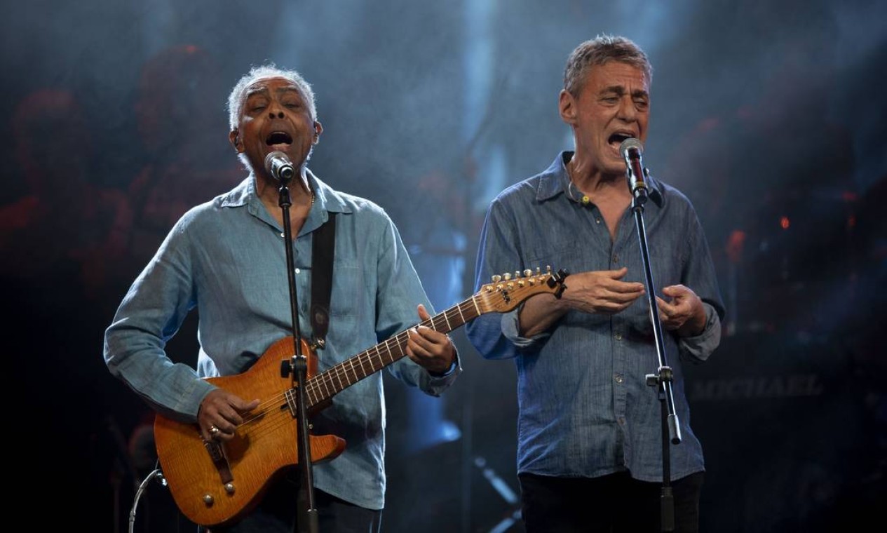 Em julho de 2018,ao lado de Gilberto Gil,Chico canta no festival "Lula Livre" — Foto: MAURO PIMENTEL / AFP