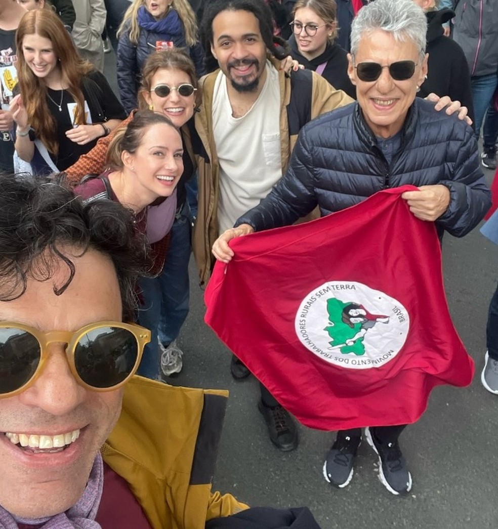 Raí e Chico Buarque (com bandeira do MST) em manifestação em Paris — Foto: Reprodução Instagram
