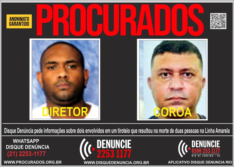 Quem tiver informações sobre o paradeiro de dois dos criminosos que participaram de uma tentativa de assalto na Linha Amarela,que terminou com a morte de duas pessoas,podem entrar em contato com o Disque Denúncia. O anonimato é garantido. Os suspeitos foram identificados como Ricardo dos Santos Ferreira,vulgo “Bu ou Diretor”,de 37 anos e Carlos Henrique Ferreira de Brito,vulgo “Coroa”,de 41.
