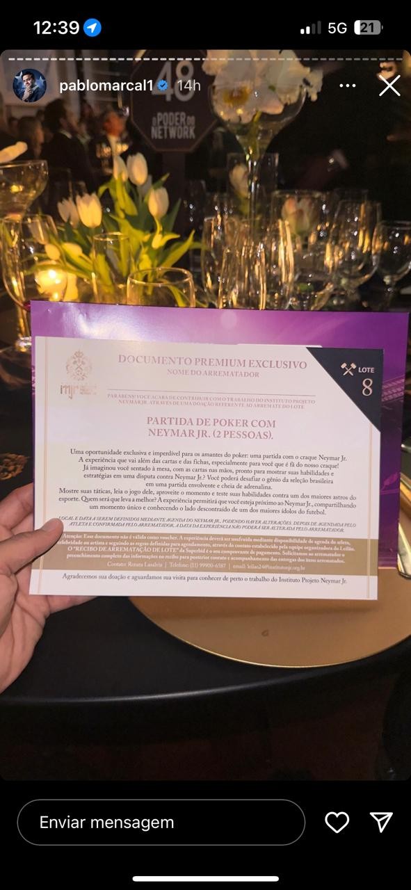 Leilão de Neymar: Pablo Marçal arrematou partida de poker com Neymar Jr. — Foto: Divulgação