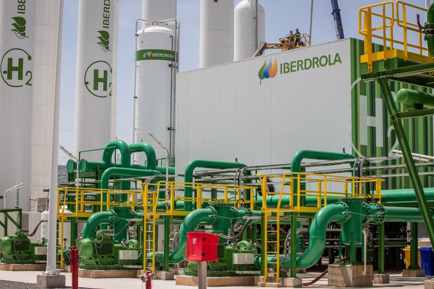 Tanques para armazenar hidrogênio verde em usina da Iberdrola,na Espanha,uma das maiores da Europa para a produção do combustível — Foto: Angel Garcia/Bloomberg