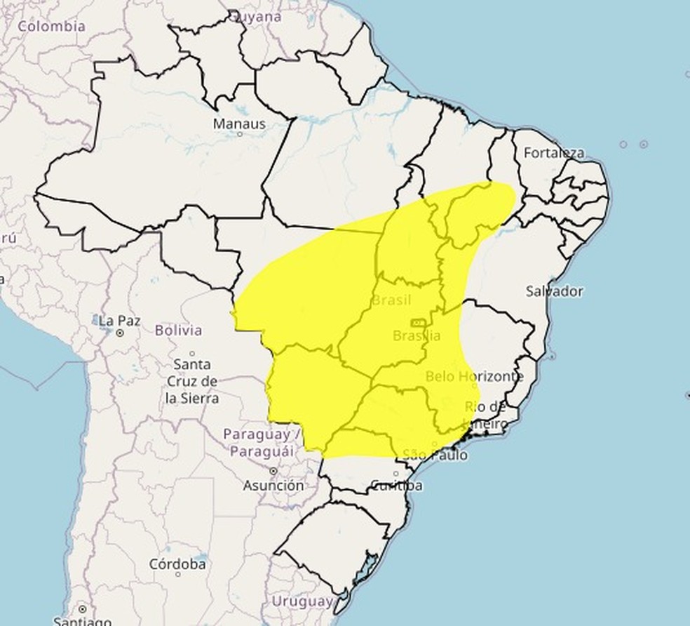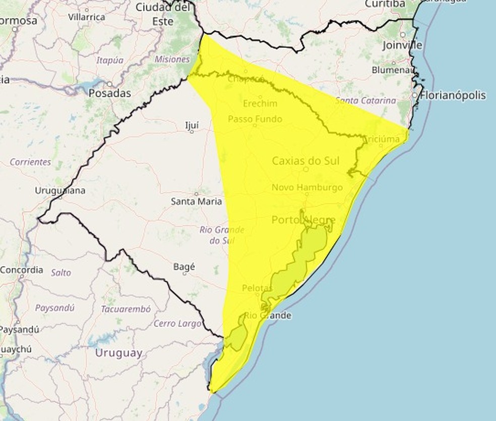 Mancha amarela indica área de atuação de alerta de "Perigo potencial" para tempestades — Foto: Divulgação