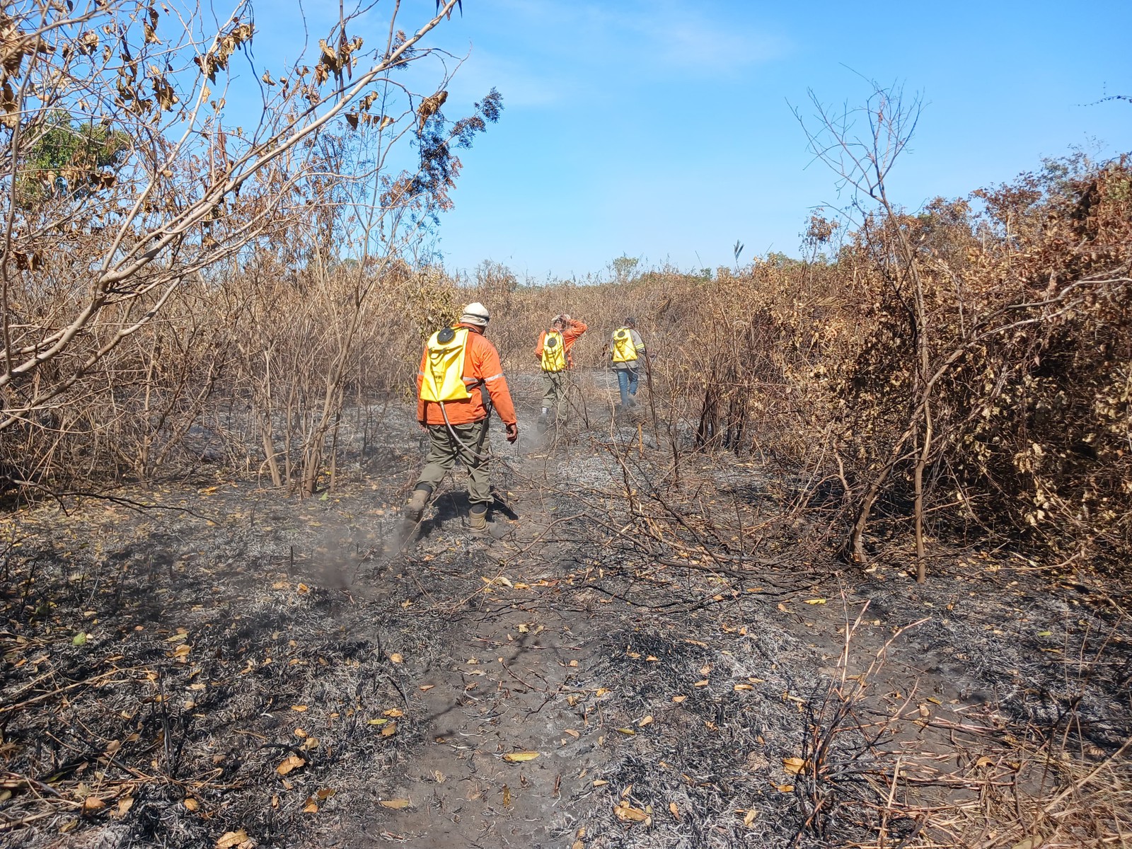Foto divulgada pelo Corpo de Bombeiros de Mato Grosso do Sul mostra bombeiros fiscalizando uma área queimada por um incêndio florestal no Bioma Pantanal,no estado de Mato Grosso do Sul — Foto: Handout / MATO GROSSO FIREFIGHTERS DEPARTMENT / AFP