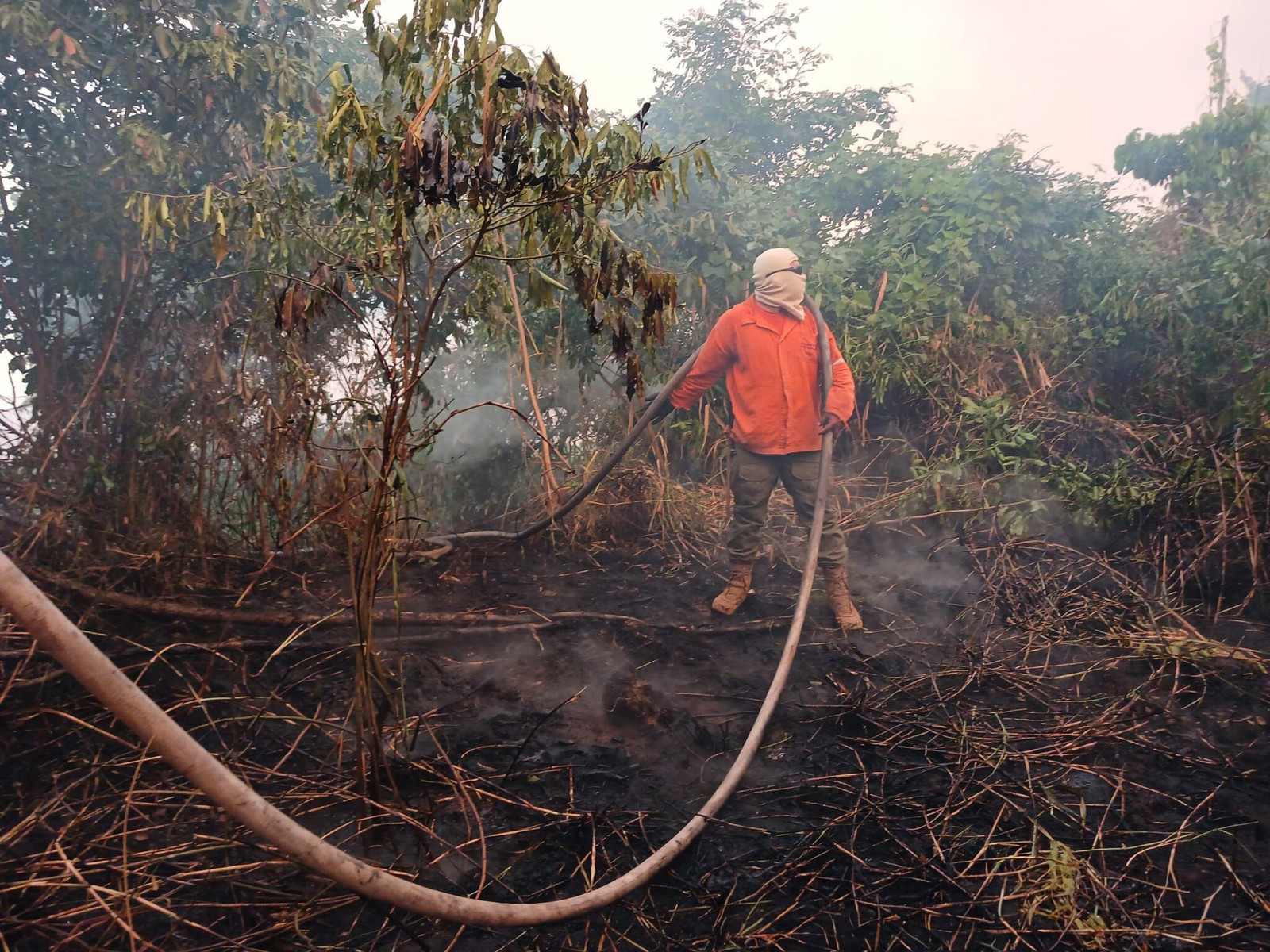 Foto divulgada pelo Corpo de Bombeiros de Mato Grosso do Sul mostra bombeiros fiscalizando uma área queimada por um incêndio florestal no Bioma Pantanal,Região Abobral,localizado na cidade de Corumbá,no estado de Mato Grosso do Sul — Foto: Handout / MATO GROSSO FIREFIGHTERS DEPARTMENT / AFP