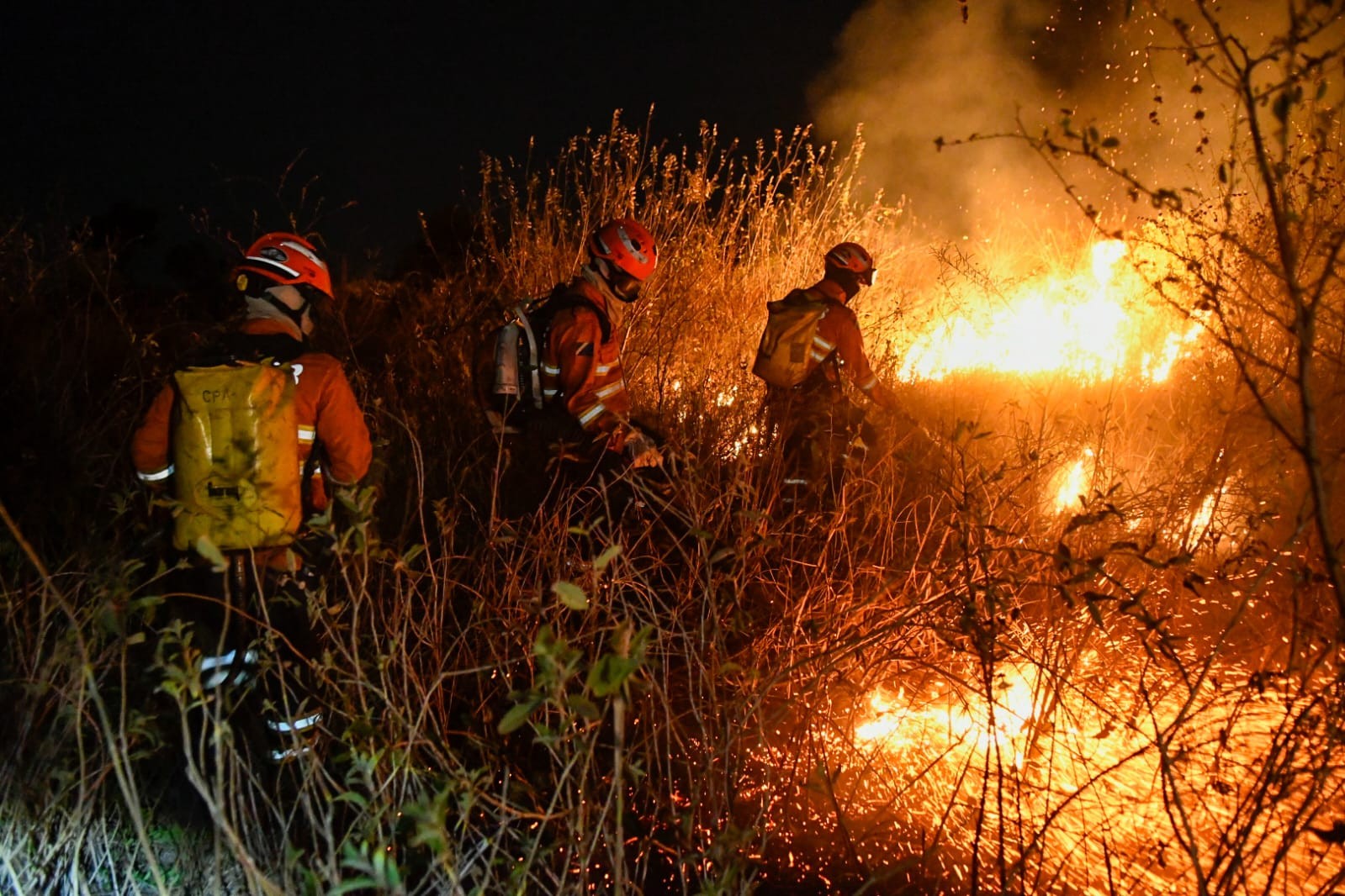 Foto divulgada pelo Corpo de Bombeiros de Mato Grosso do Sul mostra bombeiros fiscalizando uma área queimada por um incêndio florestal no Bioma Pantanal,no estado de Mato Grosso do Sul — Foto: Handout / MATO GROSSO FIREFIGHTERS DEPARTMENT / AFP