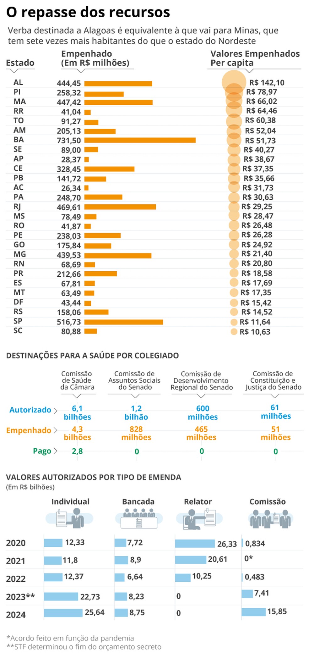 O Ministério da Saúde já empenhou,ou seja,reservou para o gasto,R$ 5,de acordo com dados do Fundo Nacional de Saúde. Desses recursos,R$ 444 milhões foram para Alagoas,valor equivalente ao de Minas Gerais,que tem sete vezes mais habitantes. Foram R$ 142 por alagoano. Por essa mesma métrica,a segunda unidade da Federação mais beneficiada é o Piauí,com o equivalente a R$ 78 por habitante.