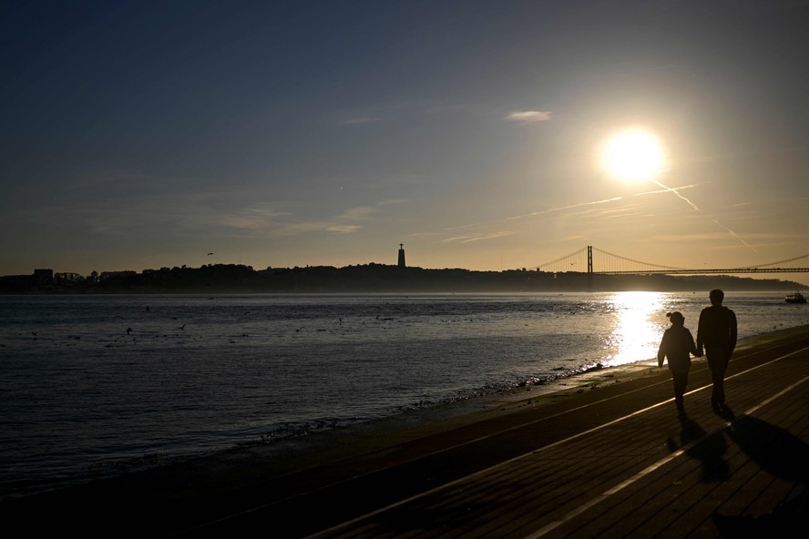 Casal caminha à beira do Rio Tejo,em Lisboa — Foto: Patrícia de Melo Moreira/AFP