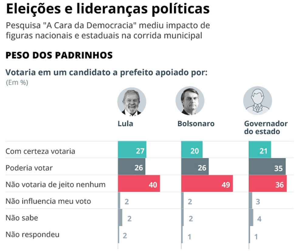Pesquisa 'A Cara da Democracia' mediu como os brasileiros reagem a apoios de Lula e de Bolsonaro a candidatos às prefeituras em 2024 — Foto: Editoria de Arte