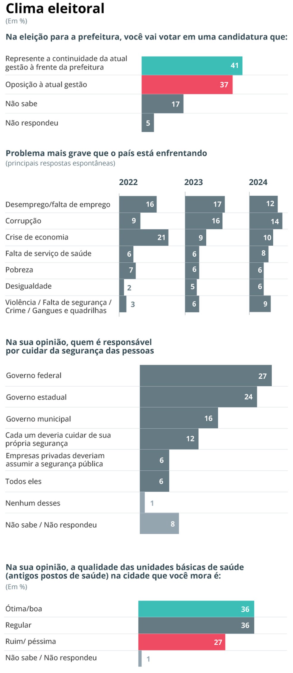 Os dados também sugerem um avanço da agenda da segurança pública. Questionados sobre o “problema mais grave do país”,um total de 9% dos entrevistados citam temas correlatos. Em 2022,eram 3%.