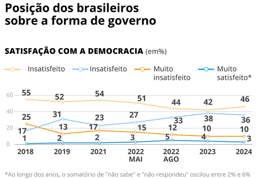 Ainda existem problemas. Quando a gente pergunta se um golpe de Estado se justificaria em alguma circunstância,o interessante é que,dentre os itens que a gente sempre mediu desde 2018,dois sempre tiveram maioria a favor. Agora,apenas um tem. O golpe de Estado já não se justifica no caso de alta criminalidade: hoje,mais de 50% são contra. Em caso de muita corrupção,há empate técnico: 49% falam que seria justificada a tomada de poder pelos militares,mas 47% dizem que não. O bolsonarismo ainda influencia como a democracia é vista. Mas a derrota dele também permitiu elementos importantes de recuperação democrática que precisam ser ressaltados.