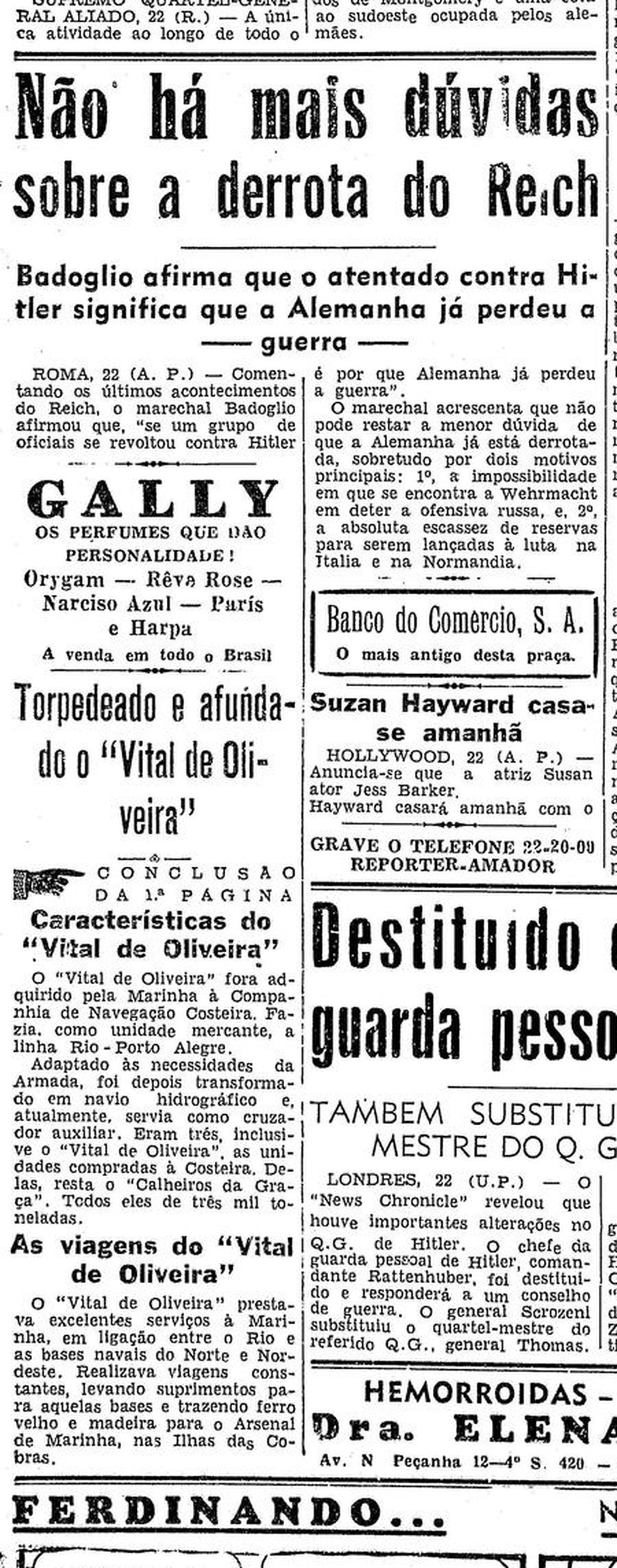 Capa do jornal da edição do jornal O Globo em 22 de julho de 1944,data em que o naufrágio do navio Vital de Oliveira foi noticiada — Foto: Foto: Acervo O Globo