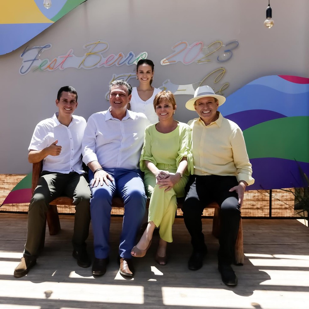 O deputado Domingos Neto (primeiro à esquerda) ao lado do ministro da Agricultura,Carlos Fávaro,e da mãe,prefeita de Tauá: feira agro conhecida como 'Festberro' foi contemplada com verba — Foto: Reprodução/Redes sociais