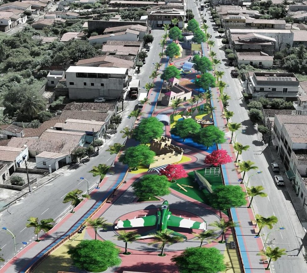 Projeto da nova Praça da Rodoviária,que fica em um dos acessos a Nova Russas (CE): prefeita Giordanna Mano agradeceu ao marido,o deputado Junior Mano (PL-CE),pelos recursos — Foto: Reprodução/Redes sociais