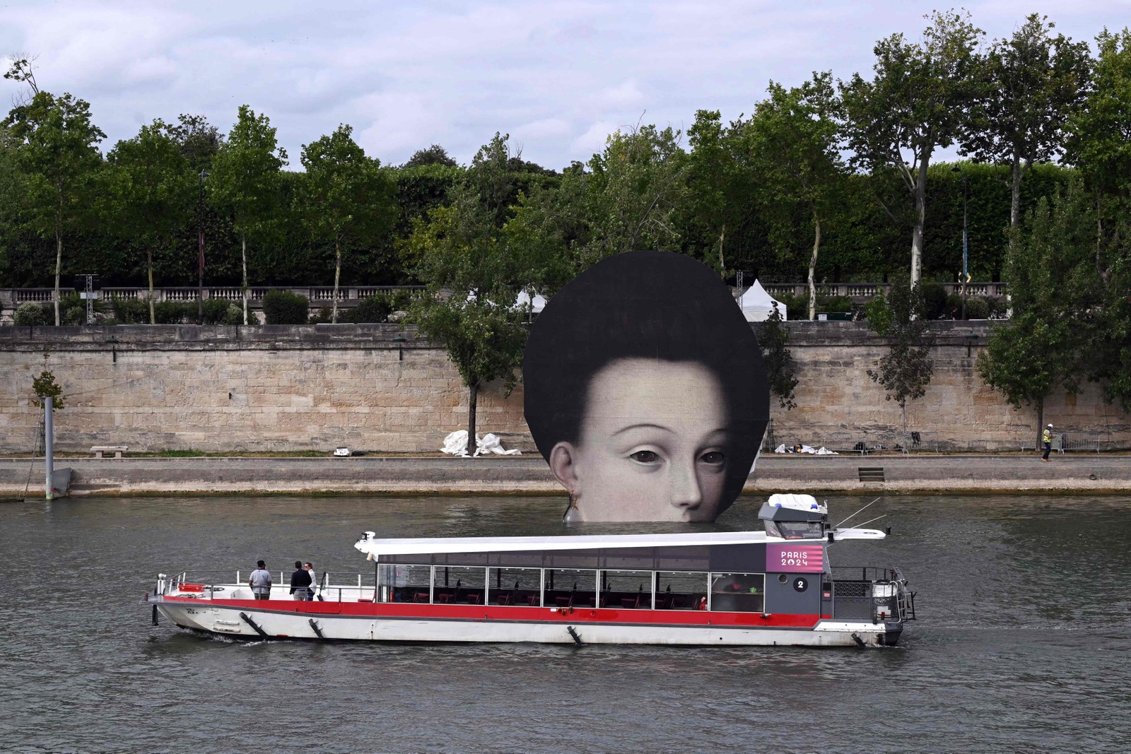 Barco navega pelo Sena diante de mural instalado para cerimônia de abertura de Paris-2024 — Foto: SEBASTIEN BOZON / AFP