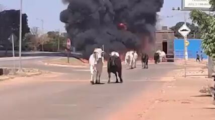 Bois que seguiam para abate em frigorífico correm pelas ruas de cidade de MT após caminhão pegar fogo