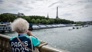 Mulher observa preparação do Rio Sena para abertura de Paris-2024 — Foto: AFP
