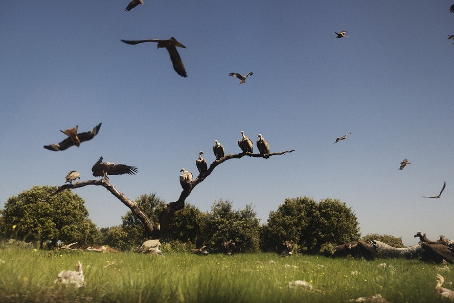 Abutres selvagens alimentam-se de galinhas mortas na Reserva Biológica Campanarios de Azaba,perto de La Alamedilla,Espanha,17 de abril de 2014 — Foto: Samuel Aranda/The New York Times