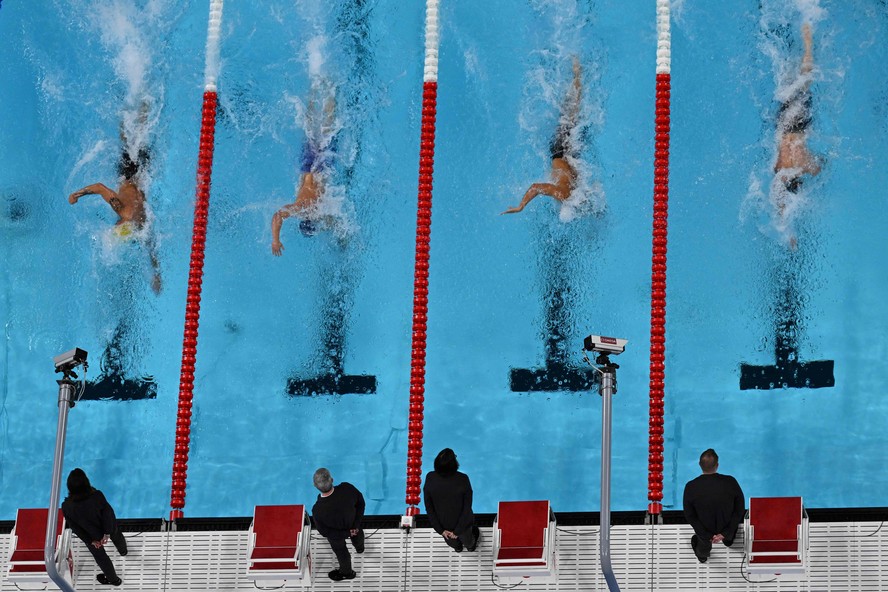 A disputa das semifinais dos 100m livre entre os homens,nos Jogos de Paris — Foto: Jonathan Nackstrand/AFP