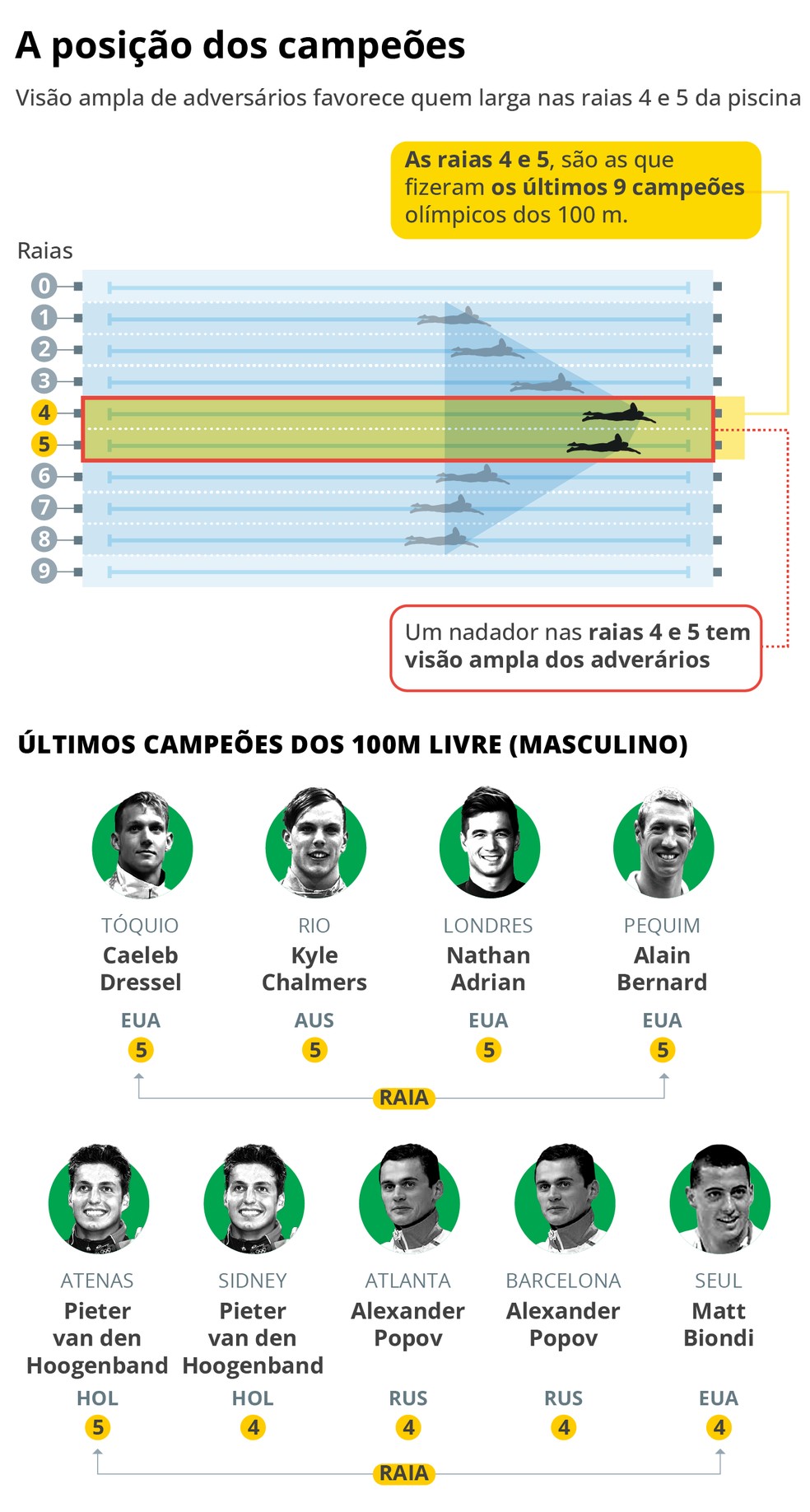 A disposição das raias na piscina e os últimos campeões olímpicos dos 100m livre entre os homens — Foto: Editoria de arte O GLOBO