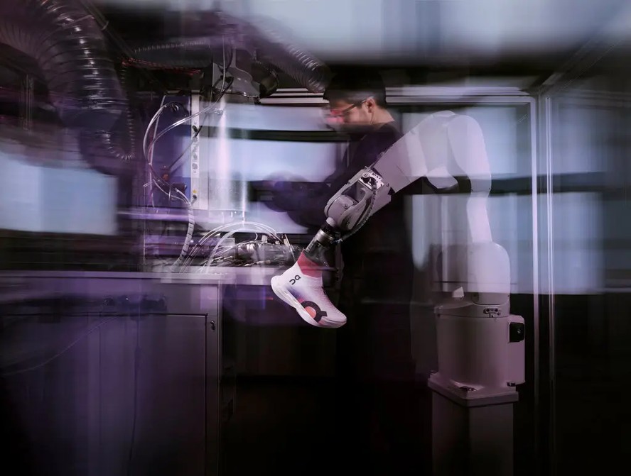Os cabedais do Cloudboom Strike LS de peça única são criados em uma única etapa usando um braço robótico automatizado nos laboratórios On em Zurique — Foto: Divulgação