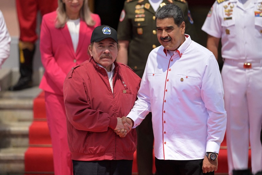 ARQUIVO: Daniel Ortega,presidente da Nicarágua,e Nicolás Maduro,presidente da Venezuela,em Miraflores,em abril de 2024 — Foto: JUAN BARRETO / AFP