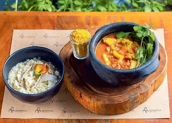 No Moringa (99543-1887),os pais que fizerem reservas ganharão um cartão feito de papel de sementes no dia,que pode ser plantado para cultivar manjericão. Uma das sugestões é a moquequinha de pupunha,risoto de coco e farofa de dendê. Serve duas pessoas e custa R$ 73 — Foto: Divulgação