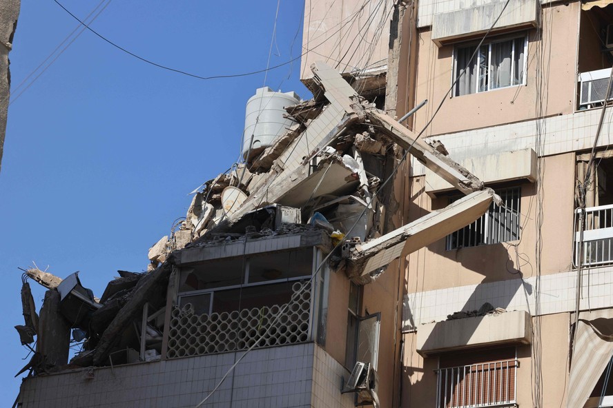 Foto mostra consequências de ataque militar israelense a edifício no subúrbio sul de Beirute,no Líbano — Foto: ANWAR AMRO / AFP