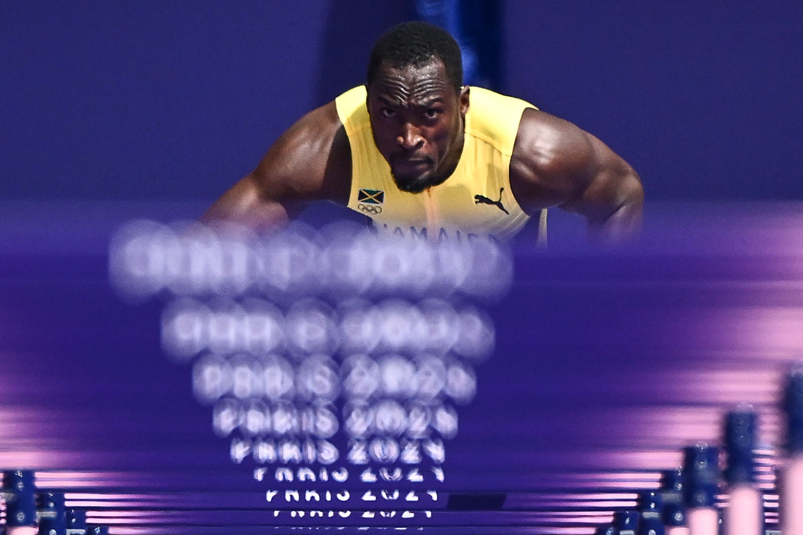 Atletas competem na repescagem dos 110m com barreiras masculino do atletismo nos Jogos Olímpicos de Paris 2024 — Foto: Kirill KUDRYAVTSEV / AFP