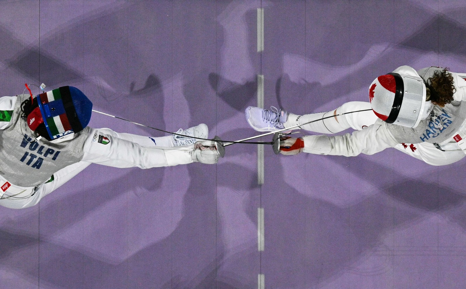A canadense Eleanor Harvey (d) e a italiana Alice Volpi na disputa pela medalha de bronze individual — Foto: Antonin THUILLIER / AFP