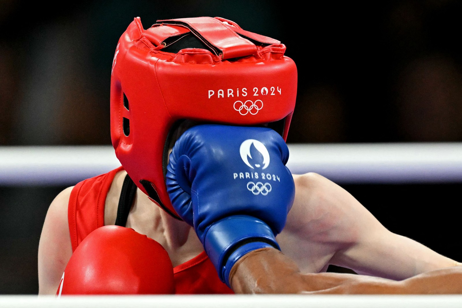Yesugen Oyuntsetseg,da Mongólia,leva um soco da colombiana Ingrit Lorena Valencia Victoria na luta preliminar feminina de boxe — Foto: MOHD RASFAN / AFP