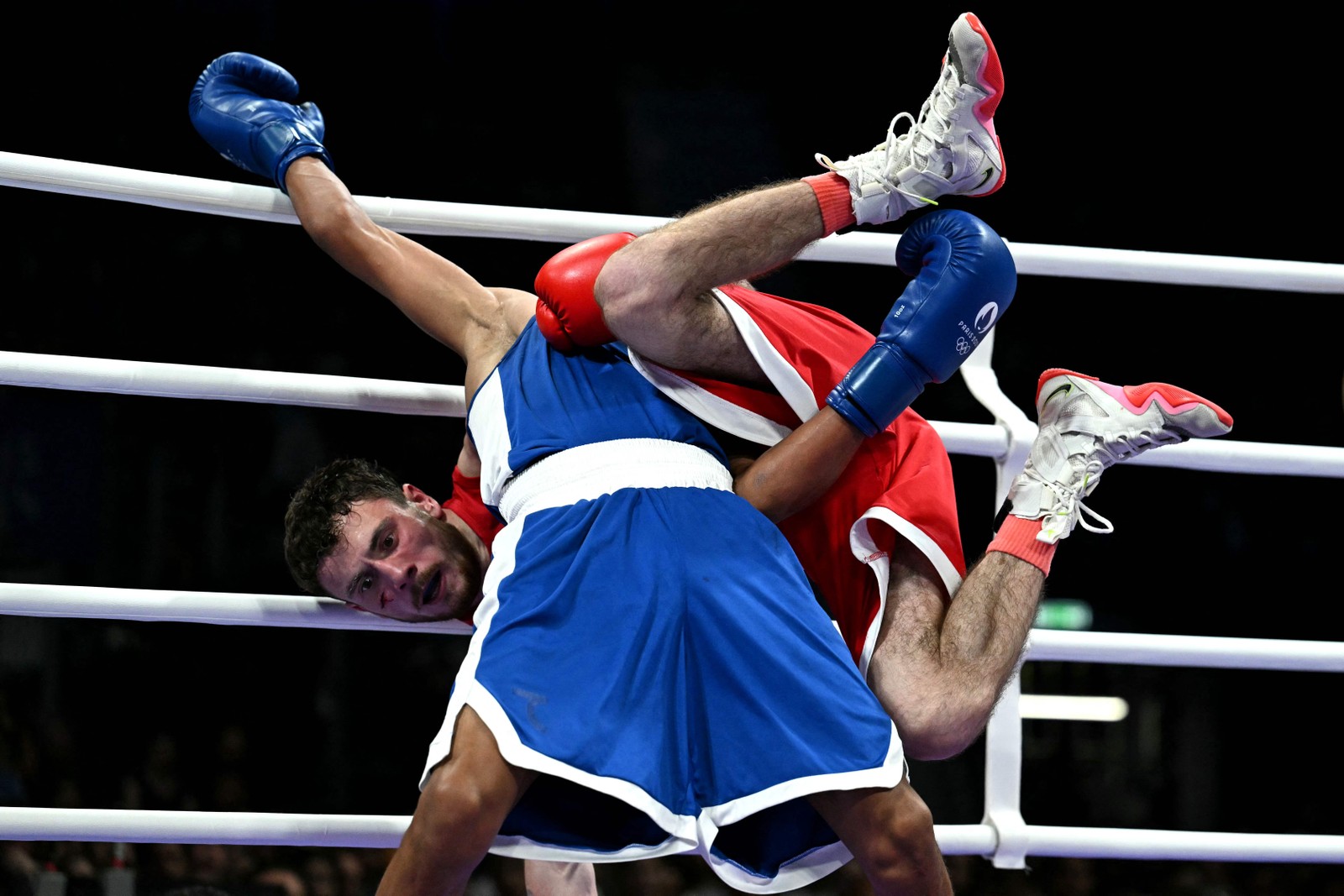 Yunior Alcantara Reyes,da República Dominicana (de azul),luta contra Nijat Huseynov,do Azerbaijão — Foto: MOHD Rasfan/AFP