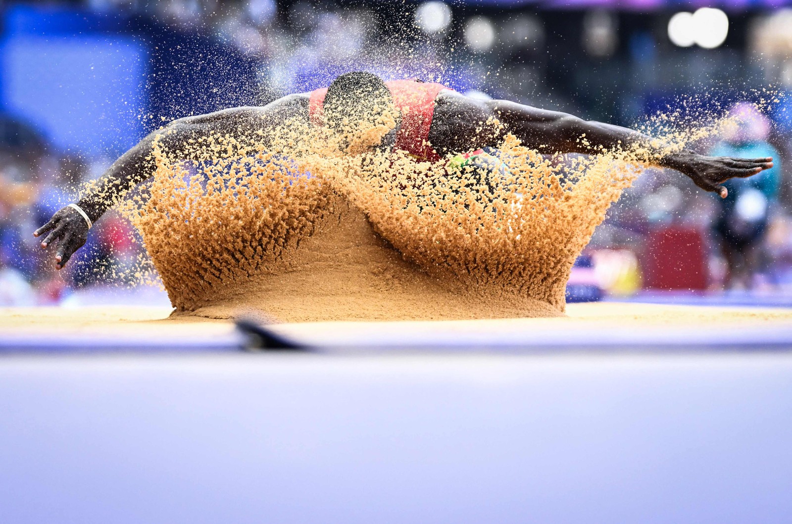 Atleta durante a qualificação do salto triplo feminino no atletismo das Olimpíadas 2024 — Foto: Martin BERNETTI / AFP