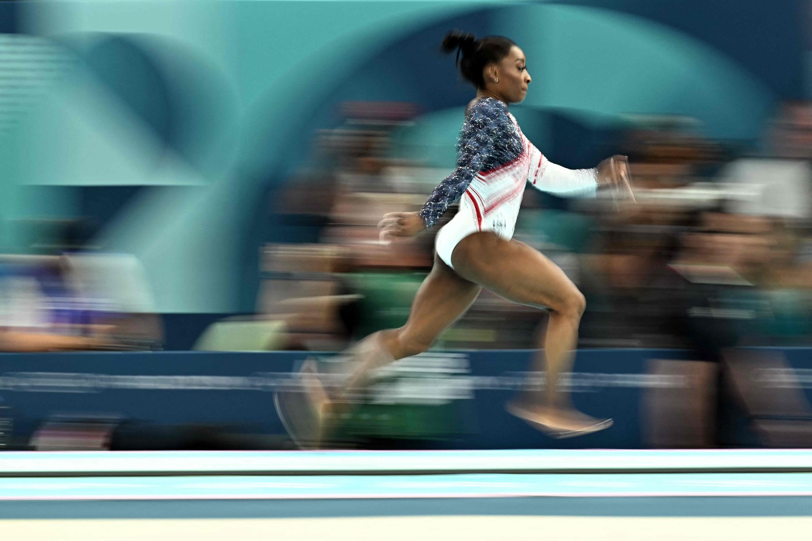 A americana Simone Biles compete na prova de salto na final por equipes femininas de ginástica artística — Foto: Lionel Bonaventure / AFP