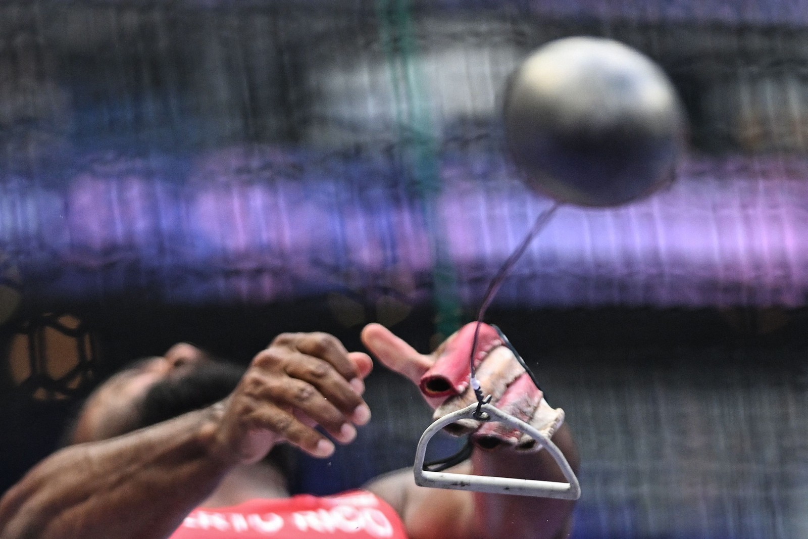 Jerome Vega,de Porto Rico,em detalhe durante lançamento de martelo masculino no atletismo — Foto: Kirill KUDRYAVTSEV / AFP