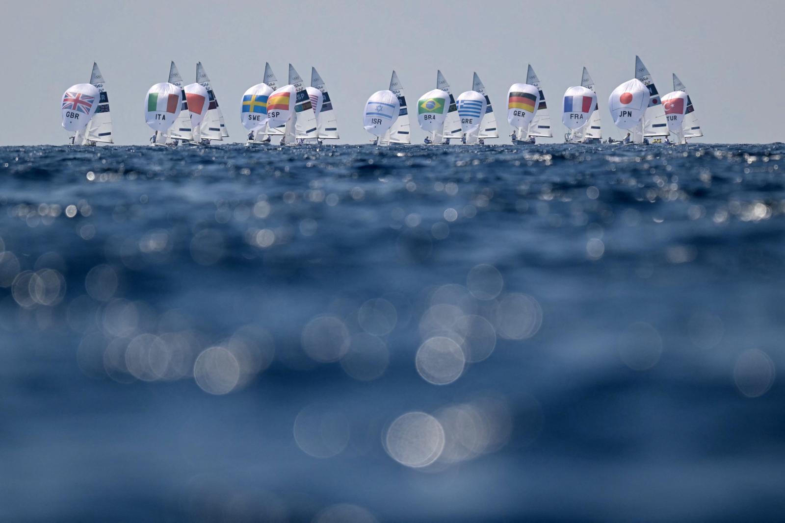 Equipes de vela alinhadas no horizonte durante os Jogos Olímpicos de Paris 2024 — Foto: Nicolas TUCAT / AFP