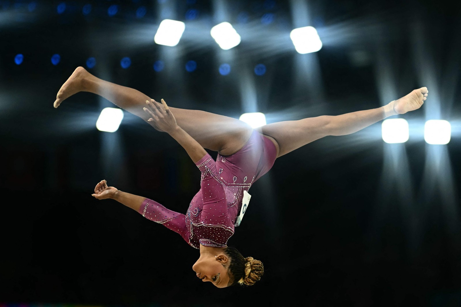 Rebeca Andrade compete na final feminina da trave de equilíbrio da ginástica artística durante os Jogos Olímpicos de Paris 2024 — Foto: Loic VENANCE / AFP