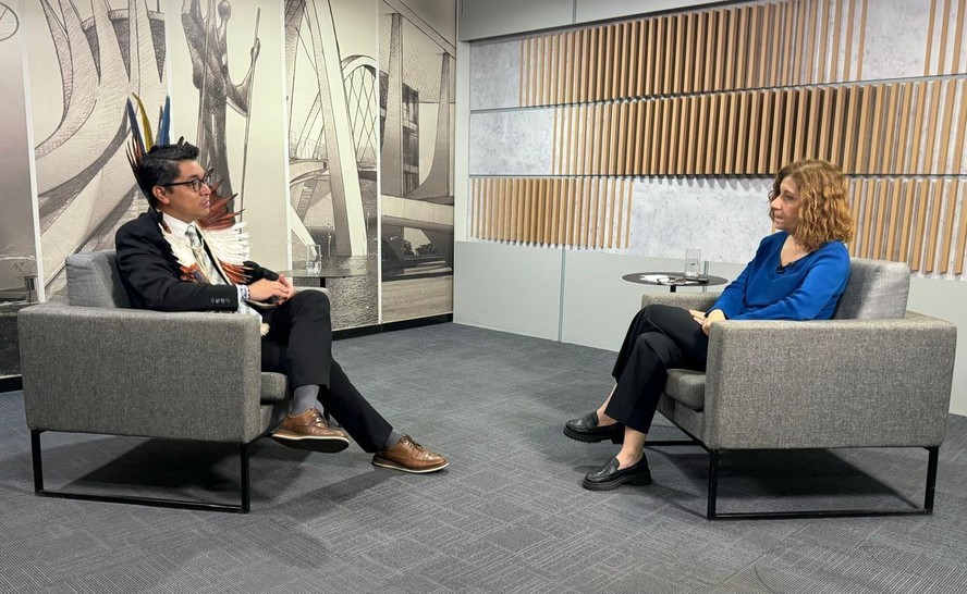 Eloy Terena é entrevistado por Míriam Leitão na GloboNews — Foto: Divulgação