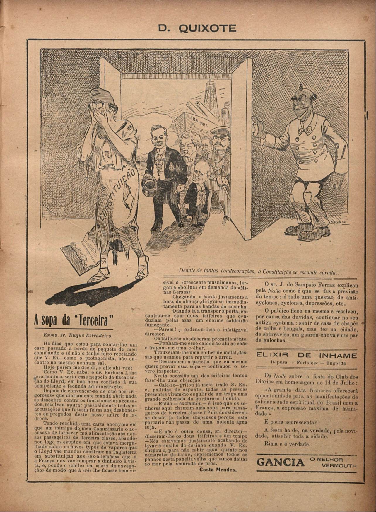 Há tempos,os presentes a chefes de estado são alvos de críticas. Charge publicada na revista D. Quixote mostra o então presidente,Epitácio Pessoa,ao chegar ao Brasil,vindo de suas viagens na Europa e nos Estados Unidos,cheio de condecorações,o que não era permitido na época. "Diante de tantas condecorações,a Constituição se esconde corada",diz a legenda — Foto: Biblioteca Nacional