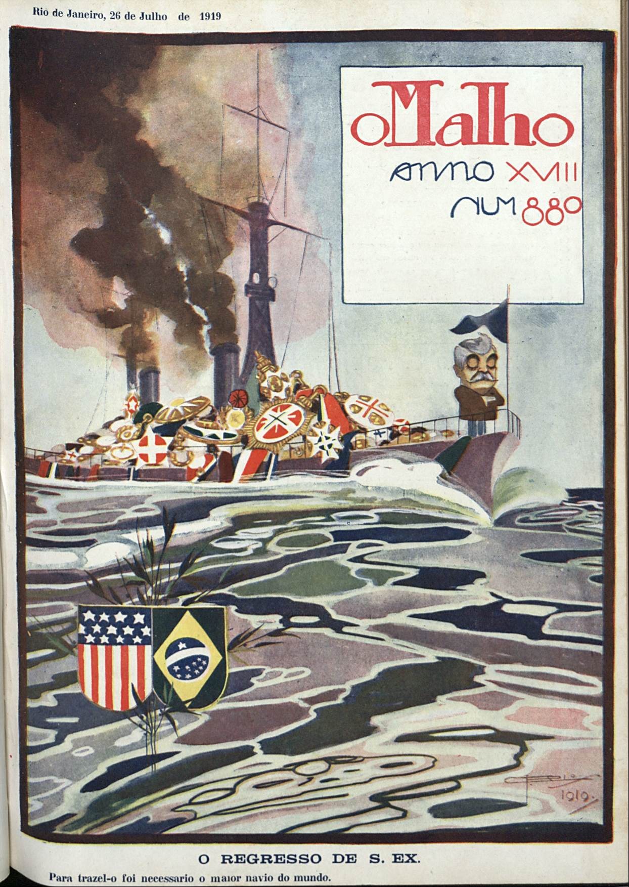 Outra charge publicada na revista O Malho retrata Epitácio Pessoa na proa de um navio cheio de medalhas. “Para traze-lo foi necessário o maior navio do mundo”,diz a legenda. Receber condecorações não era permitido pela Constituição vigente — Foto: Biblioteca Nacional