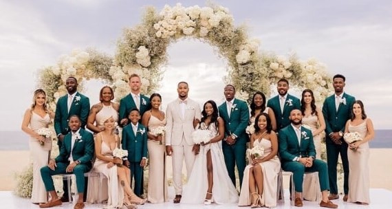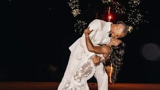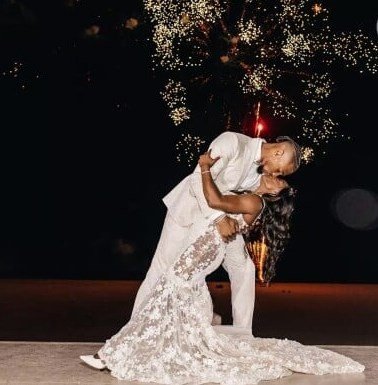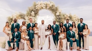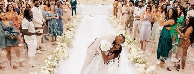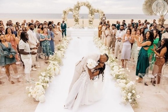 Simone Biles e Jonathan Owens se beijam na cerimônia que aconteceu em uma praia,no México — Foto: Reprodução da internet