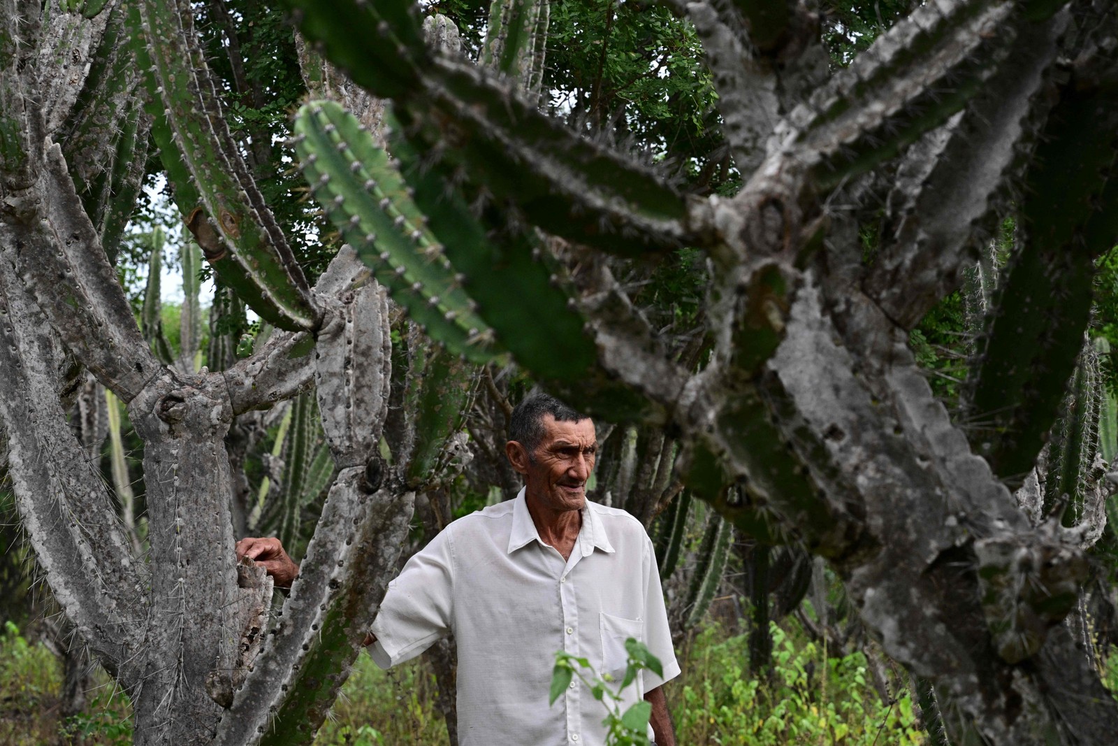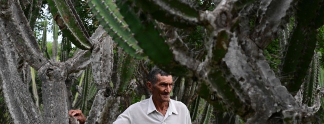 Cactos espinhosos gigantes se erguem sobre o fazendeiro Alcides Peixinho Nascimento,de 70 anos,um dos moradores de uma região da Caatinga — Foto: Pablo Porciuncula/AFP