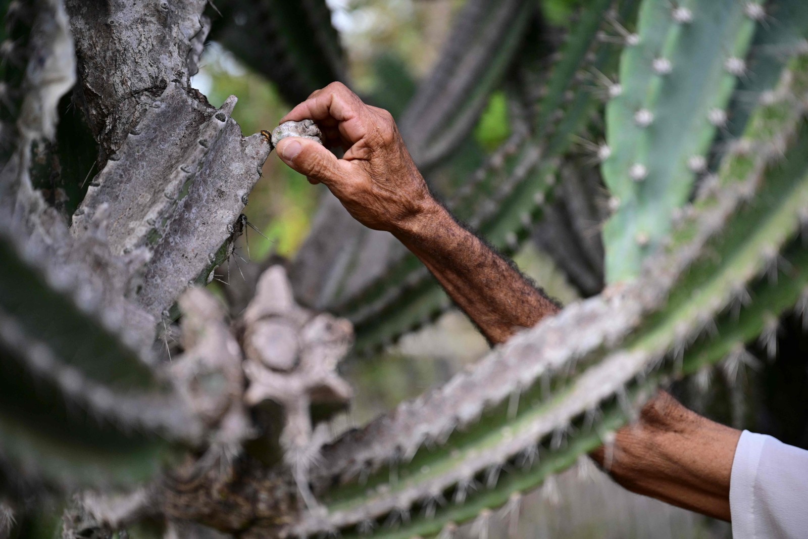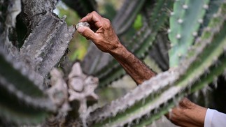 Nascimento tenta regenerar a terra plantando mandacaru,um cacto emblemático da região que cresce até seis metros de altura — Foto: Pablo Porciuncula/AFP