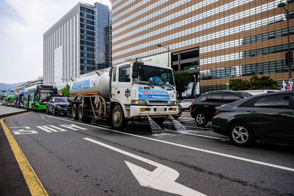 Caminhões-tanque pulverizam água para resfriar o asfalto nas ruas de Seul — Foto: ANTHONY WALLACE / AFP
