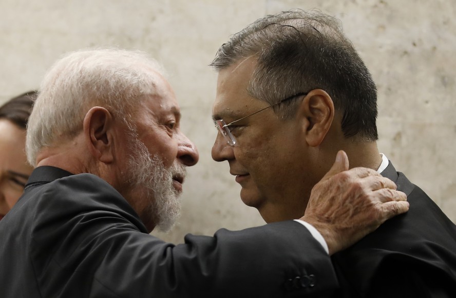 Dino é cumprimentado pelo presidente Lula durante sua posse no STF — Foto: Cristiano Mariz / Agência O Globo
