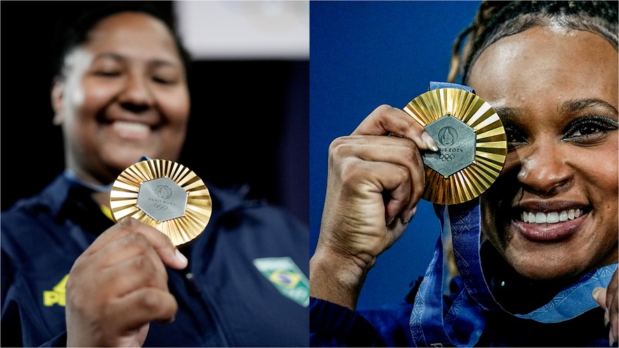 Beatriz Souza (judô) e Rebeca Andrade (ginástica artística) foram as primeiras medalhas de ouro do Brasil na Olimpíada — Foto: Colagem de fotos de Alexandre Loureiro/COB